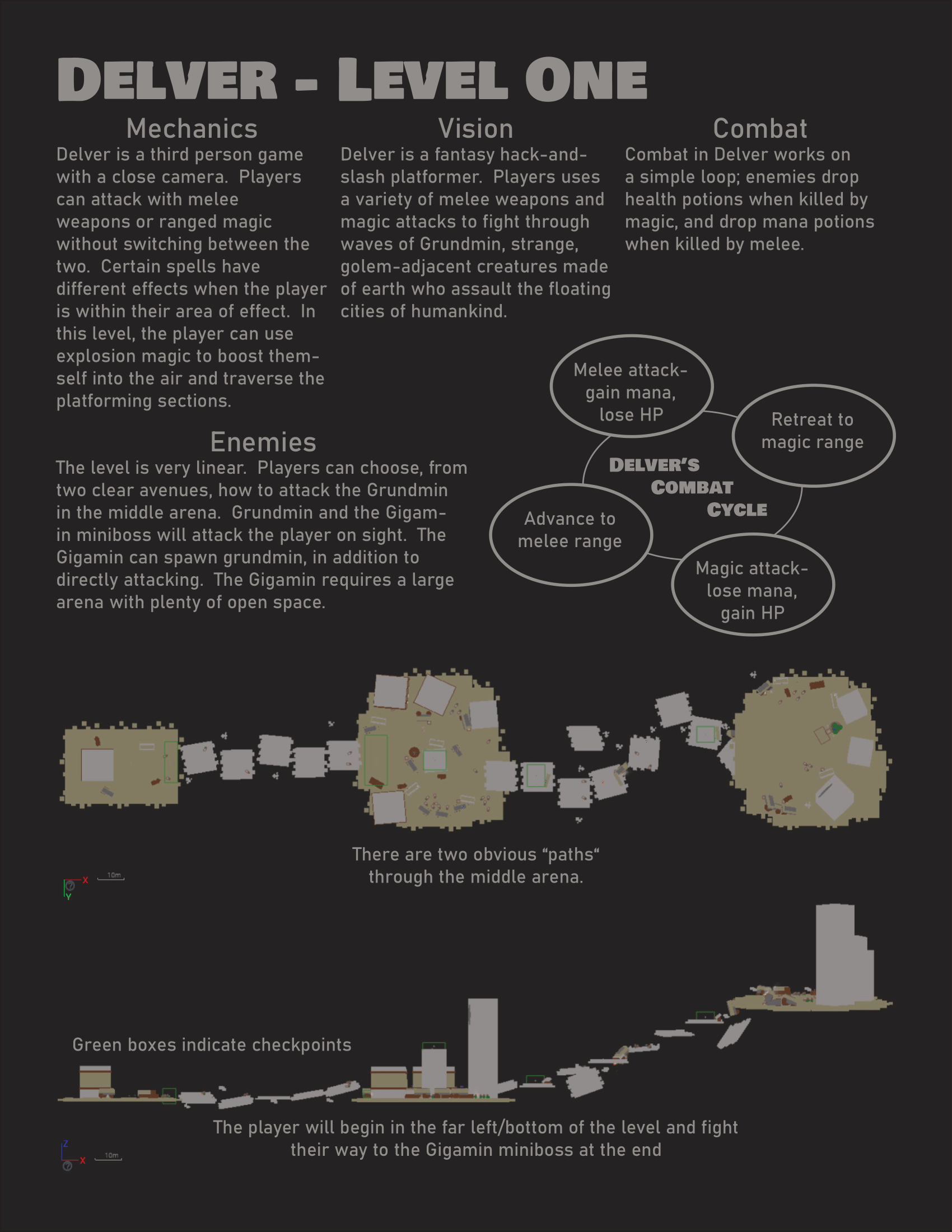 One-page documents are my preferred method of communicating complex ideas. The above are examples from some of my other projects - Press_Space was a single-input game jam game, "The School" is one of three levels in Syke, and Delver was a project for a design class. I do want to note that many of these designs predate my understanding of grid-based design, and they will be updated as I continue to improve my skills.